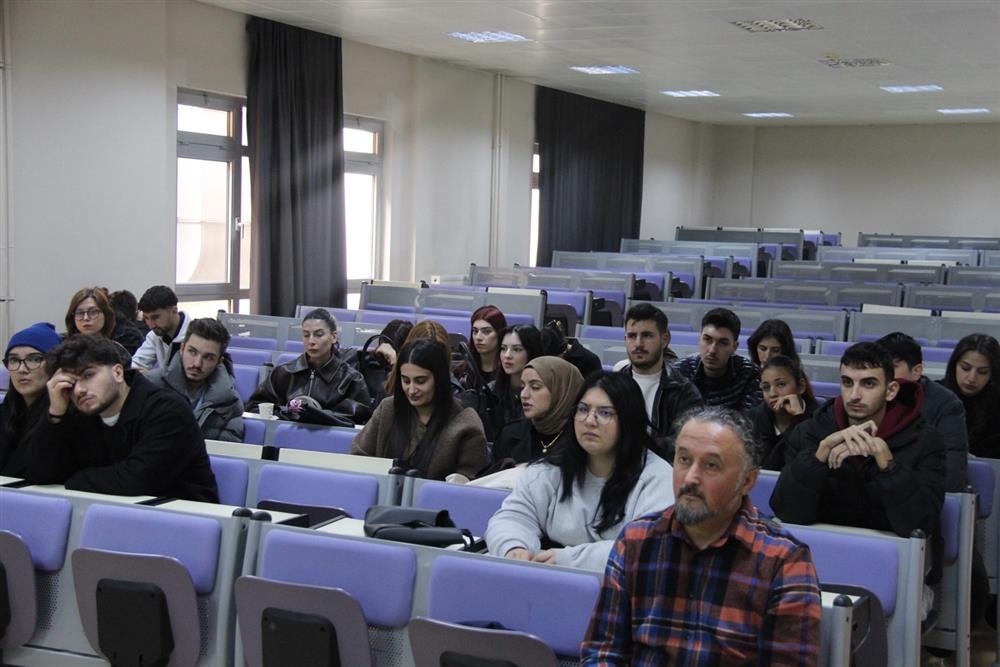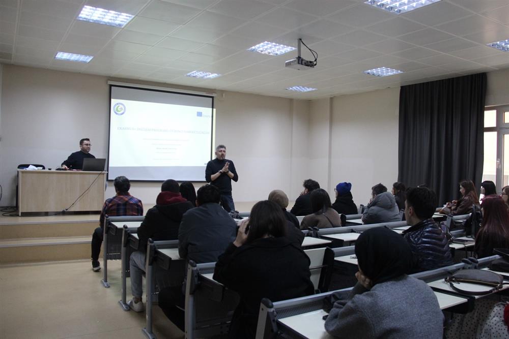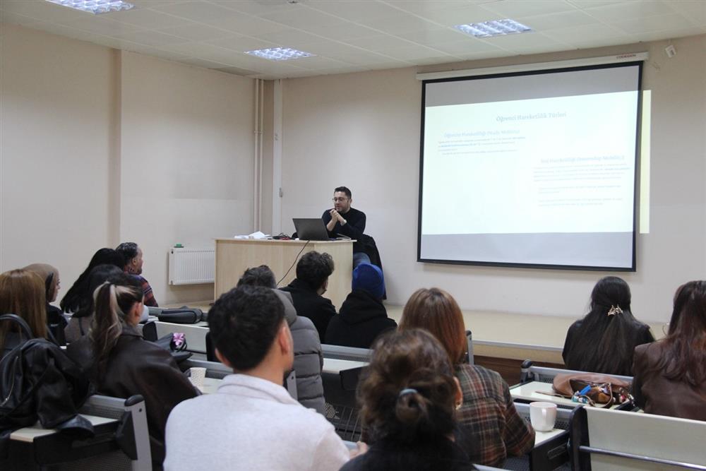 The session was conducted by Erasmus+ Student Mobility Officer, Lecturer Murat Yaman, on February 25, 2026, at the Merve Durmuş Lecture Hall. During the program, students were provided with detailed information on how to benefit from study abroad and internship opportunities.