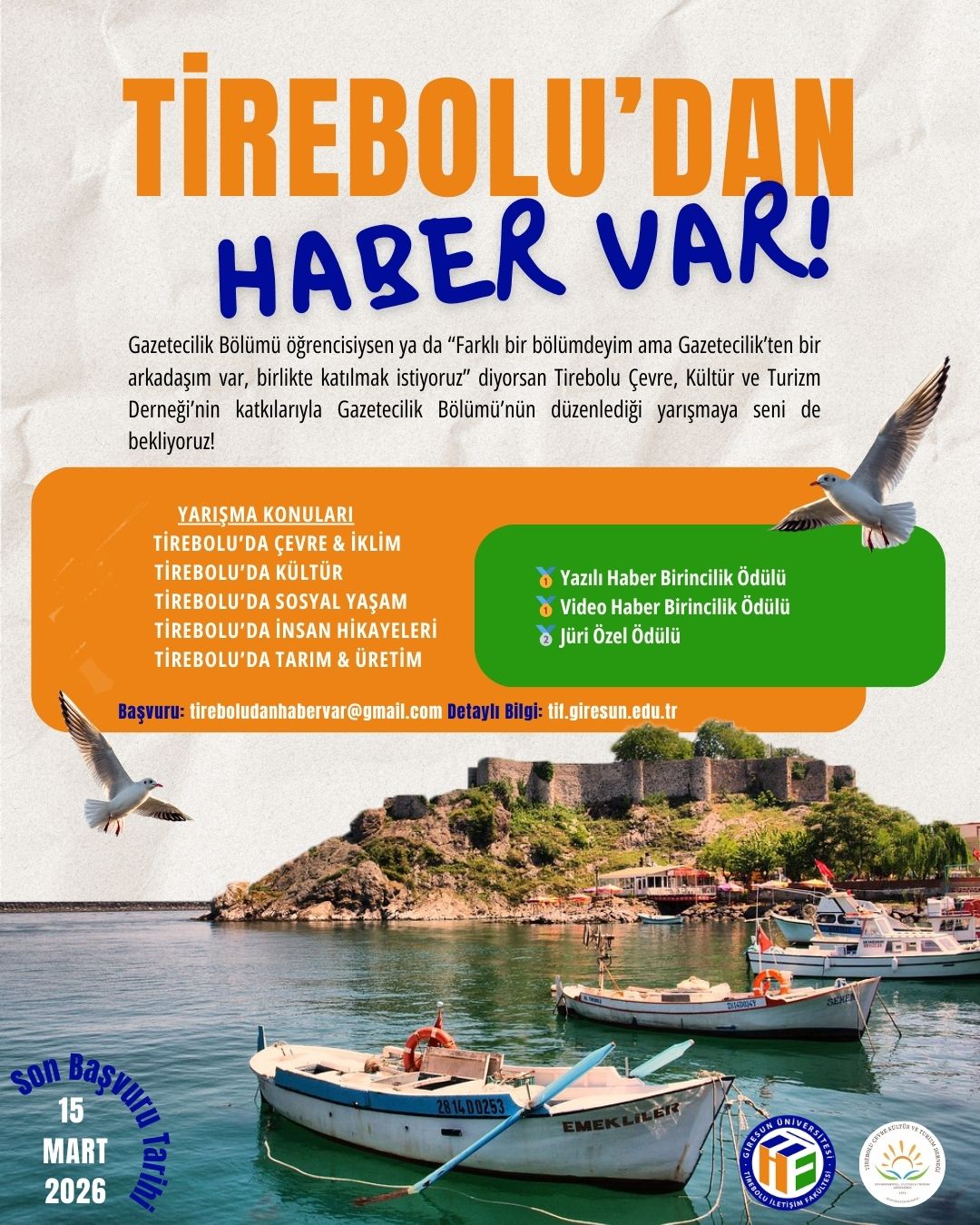 Giresun Üniversitesi Tirebolu İletişim Fakültesi Gazetecilik Bölümü tarafından, Tirebolu Çevre, Kültür ve Turizm Derneği’nin katkılarıyla Fakültemiz Gazetecilik Bölümü öğrencilerine yönelik “Tirebolu’dan Haber Var!” başlıklı bir haber yarışması düzenlenmektedir.